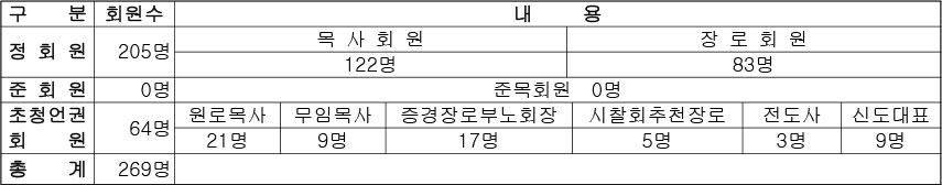 4. 회원 : 목사회원 83명, 원로목사회원 4명, 무임목사회원 1명, 장로회원 46명, 준회원 1명, 초청언권위원 13명, 시찰추천 장로언권회원 3명, 전도사 1명, 신도대표 4명으로 총 156명이더라.